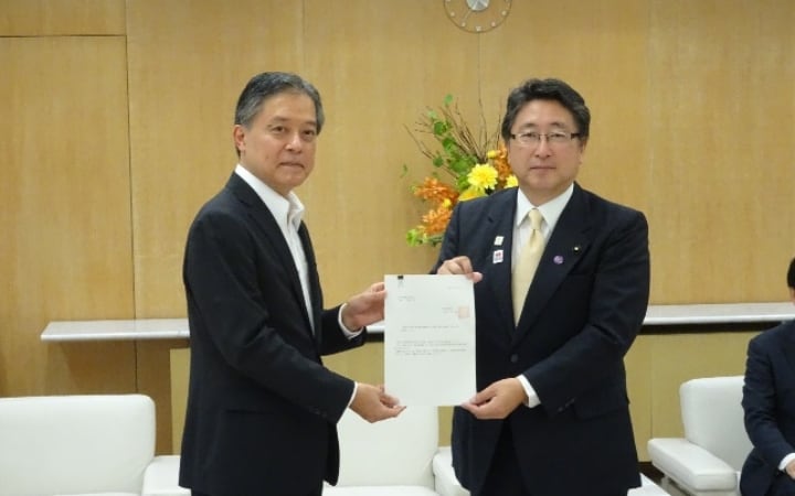 〔写真2枚目〕増子議長(写真右)が、渡辺特別区議会議長会会長(写真左)から要請書を受領